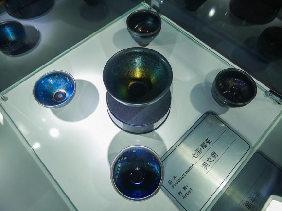 在首发式的现场,福建省工艺美术大师黄文勇带来了自己的多款七彩曜变代表作,有最为经典的黄氏束口款、玄款,以及收藏级别的大口径束口款,虽为数不多,但款款经典。