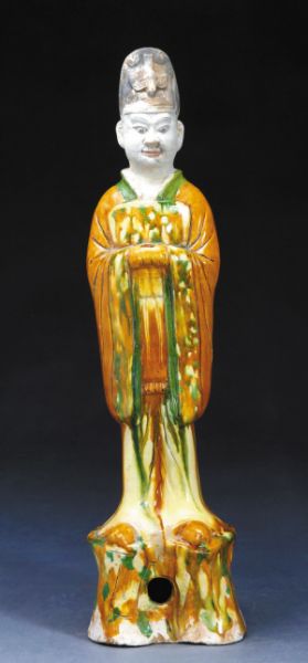 面庞丰腴,白净文雅,神情肃穆刚正,着赭黄色敞领宽袖袍,袖口镶绿色边。脚穿如意云头履,头戴飞鸟装饰的幞头,脚穿如意头云履,立在圆形细腰的须弥座上,双臂弯曲拱于胸前,双手叠于胸前,双手中间有一孔(应为上朝时捧笏板的样子),神态矜持肃穆。施黄、绿、白三色釉,唐三彩中,文臣武将的形象不少,神态和穿着各异,但像这样能将文人道貌岸然的外表和矜持尊严的内心世界刻画得如此淋漓尽致作品实在不多,尤显珍贵。这件文官俑通高76厘米,施黄、绿、白三色彩釉,是国家一级文物。