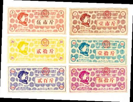 2003年8月,全国票证收藏交易会在长沙举行,一套1968年印制的“汨罗县城关粮店定量专用粮票(面额由壹市斤、伍市斤、壹拾斤、贰拾斤、伍拾斤、贰佰斤6枚组成)”一面世,即轰动了国内外收藏界。它产生的眼球效应,是该套粮票的奇特性:一是票面直接冠名粮店名称(属无权印制);二是票面发行单位公章为“汨罗县城关粮店定量粮票专用章”(非管理单位);三是票面设计有毛泽东着军装的侧面版画图像的图案,违反了当年毛泽东肖像不允许上流通票券的规定;四是全国和地方级粮票中,除“文革”中有部分印了毛泽东语录外,均没有印毛泽东肖像。