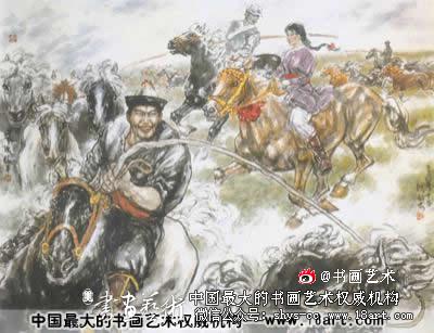 纵观易洪斌的画作,无论是骏马、狮虎、鹰隼、花卉,还是古今人物,都不仅仅是简单的“造象”,而是形神兼备,“造意”尤多,寓情理于画中,托心志于纸上,读之如饮琼浆而回味无穷。所有这些,都与易洪斌的文人气质、绘画天赋和不懈的追求分不开,也与他深切的社会责任感和崇高的人文情怀息息相关。(附图均为易洪斌的国画作品,左者为《乡村时装秀》,左下者为《草原骄子》)