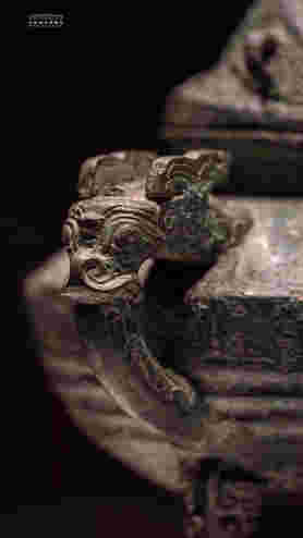 青铜“虎鎣(yíng)”为西周晚期青铜器。“鎣”有光明、美丽之意,“鎣”是“盉”(hé)的一种异称,和其他青铜器一样,在商周时期一般都是用于祭祀的礼器,西周晚期主要是用于祭祀、宴飨等典仪中“沃盥礼”的实用水器。盖内铸铭4字:“自乍(作)□ (鎣)”,第三字释读存疑。由于器盖、流部有虎形纹饰,“虎鎣”因此得名。方唇、 短束颈、宽折肩、圜底,足根饰饕餮纹,腹下部饰瓦纹,腹上部饰横S形斜角云纹,其上的伏虎造型惟妙惟肖……在灯光的照耀下,青铜“散发着神秘、高贵的光芒。