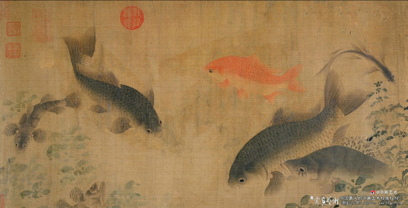 此图的开始部分先画盛开的杏花伸向水面,向后展开。落花引来群鱼争食,或聚或散,或潜游,或上浮,或回泳,翻藻戏蒲,以示水中的涵泳自然之态。其中蕴涵作者和文人们追求自由、自得其乐的诗的意境。其画法全用渲染,间或用没骨法,不见勾勒,活泼生动。这种表现方法和诗情画意,独创一格,一直为后人所仿效。无款印,历来传为刘寀所作。卷上有“乾隆御览之宝”、“嘉庆御览”等印多方,可证原系清宫旧藏之物。