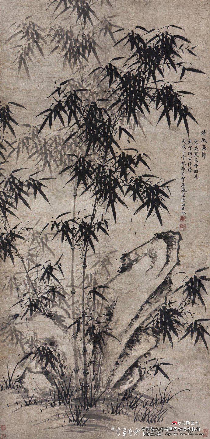 此幅《清风高节》所绘湖石一柱,风竹数杆,竹叶落墨即是,不见复笔,湖石以斧劈皴横写,从首至尾,气脉通连,浑然一体。夏昶画竹,强调气韵,主张“一气呵成”,竹叶落墨即是,不见复笔,山石以斧劈皴法大笔侧锋挥扫而成。夏昶笔下的墨竹已不仅仅是简单的文人式的寄兴抒怀,而是还竹于其自然的生长环境之中,在竹画中融入山水画的笔墨意境,表现出精深的功力和独树一帜的艺术风格。