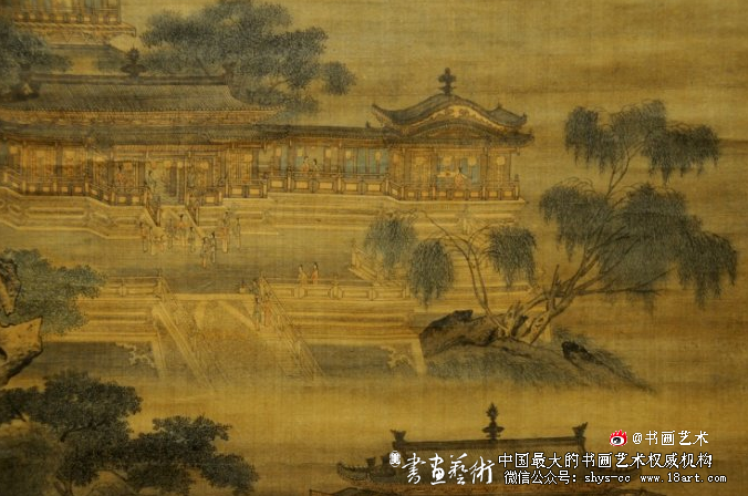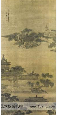 而且,他把北方雄伟壮阔、气势宏大的山水和南方清新秀美的湖光山色巧妙地结合在一起,使画面生机勃勃;再配以人物活动,使画面更富有生活情趣,耐人寻味。在色彩上,水中的宫殿用青绿设色绘出,宫殿上的瓦片纯用石绿色敷染,浓郁厚重。宫殿成为全图最引人注目的物象。山石、树木则主要用水墨绘出,略施淡彩。画面主次分明,墨色浓淡有致。