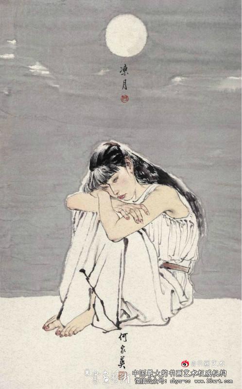 上他的幻想、理想和美好期望。他在一笔一画、精雕细刻中充分抒发、倾吐、寄托对美的向往。所以有人称他的创作是“真与幻的交响”。他用全部身心投入创作。他期望用他艺术中的真善美去弥补人生中太多的缺憾,去鞭苔现实中的假恶丑。他用富于魅力的艺术语言,描绘、展示少女的圣洁和美的梦幻,但也许由于他过于珍爱、又渴望好的永存,而在现实生活中青春却又往往短暂易逝,这种理想与现实永存的矛盾,每每在他的创作中自觉不自觉地染上一层淡淡的不可名状的忧伤。典雅的造型,斑斓的色彩,优美的线条,与对美的咏叹相表里、相统一、相和谐,婉约中又似乎蒙上了一层神秘,对立因素的统一与和谐,使何家英的艺术避免了浮面的漂亮或甜美,强化了动人的魅力,也显示了他艺术的个性特征和美学特色。