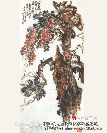王个簃的《古藤图》(见右图)便充分体现出吴门海派的鲜明特征。此图创作于1980年。纵130.5厘米,横68.5厘米,纸本设色,现藏中国美术馆。